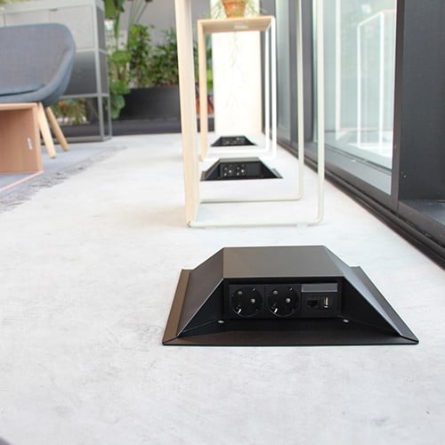 Afhankelijk van de projectbehoefte is de vloerzuil ook leverbaar met een 32 mm vloerdoos en adapterplaat, zodat je direct een geschikt aansluitpunt voor stroom- en datamodules creëert.