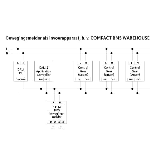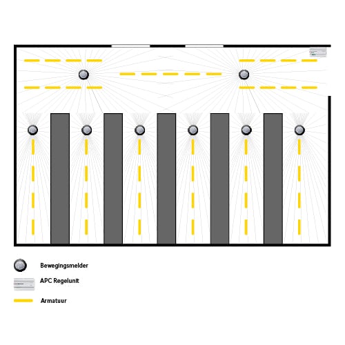In onderstaand voorbeeld is een SMARTCONTROLLER APC-DIN-railmodule toegepast, welke b.v. in de meterkast of aan de wand kan worden geplaatst. In het hoofdpad en in de stellingpaden zijn DALI-2 BMS warehouse-bewegingsmelders geïnstalleerd. Zodra een BMS-bewegingsmelder aanwezigheid in zijn gebied waarneemt, voert deze een lichtmeting uit en stuurt betreffende informatie naar de SMARTCONTROLLER, welke de verlichting regelt.